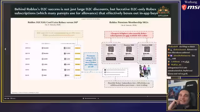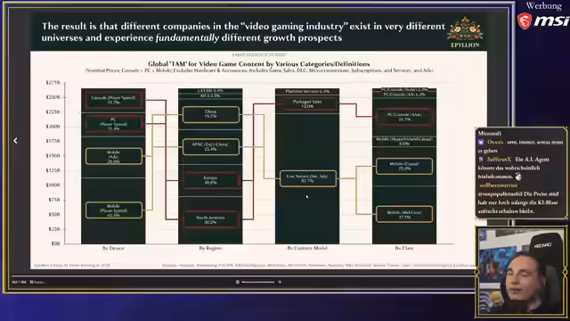 01:40:56Die Kernthese der Präsentation ist, dass die klassische Gaming-Industrie im Westen stagniert. Während der Gesamtmarkt wächst, wird dieses Wachstum hauptsächlich von China, Roblox und Mobile-Casino-Spielen angetrieben. Werden diese Faktoren herausgerechnet, wächst der Markt für traditionelle PC- und Konsolenspiele nicht mehr. Die Entwicklung wird teurer, während die Konkurrenz durch die wachsende Anzahl an Spielen und die Bindung der Spieler an Servicegames wie Fortnite zunimmt.