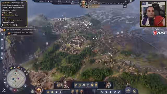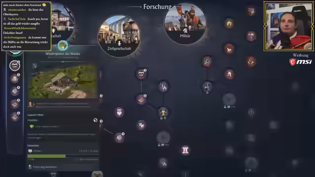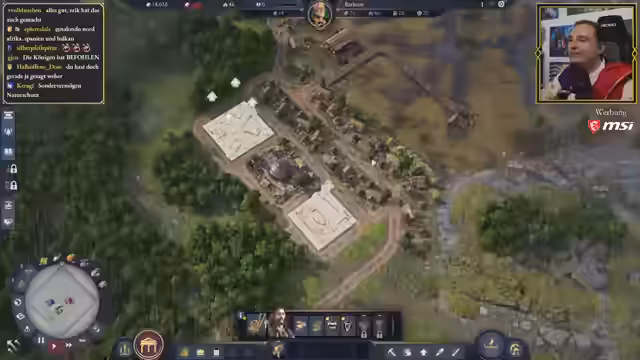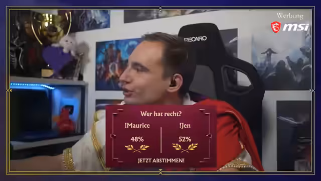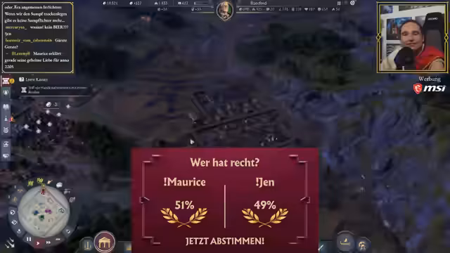 04:01:37Es kommt zu humorvollen Rollenspielen, bei denen Jen in ihrer „Prinzessin-Persönlichkeit“ aus einem früheren Stream schlüpfen soll und Maurice als „Mauritius von Weberlich“ agiert. Es wird über die Anstrengung solcher Rollen gesprochen und Maurice beklagt, dass er durch das Sponsoring gezwungen sei, den „dekadenten Römer“ zu spielen, obwohl er eigentlich naturverbunden sei. Die Spieler erkunden die Karte und entdecken andere KI-Siedlungen. Die Rollenverteilung im Koop wird vertieft: Maurice kümmert sich um die Produktion und das Geld, während Jen dekoriert. Die erste wichtige Abstimmung steht an: Sollen die Spieler den römisch-keltischen Weg wählen, der sich auf Wirtschaft und Forschung konzentriert und Sumpfgebiete trockenlegt, oder den keltischen Weg, der die Natur verehrt und auf lokale Gottheiten setzt? Maurice plädiert für den römischen Weg, um den Sumpf trocken zu legen und Platz für Wohnhäuser zu schaffen, während Jen die Bewahrung des Sumpfes für „Liebe und Natur“ verteidigt. Die Abstimmung endet mit einem Sieg für den keltischen Weg, was Maurice humorvoll als Manipulation der „niederen Gelüste des Volkes“ bezeichnet.