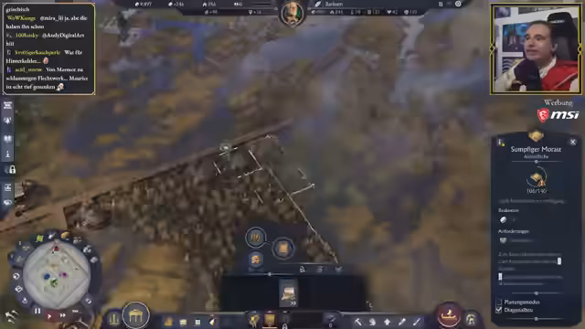 03:52:52Die Spieler beginnen langsam, da viel geredet wird, was den Zuschauern ermöglicht, das Spiel in Ruhe zu lernen. Die Startinsel in Albion präsentiert sich mit einem riesigen Sumpfgebiet, was eine wichtige Entscheidung für die zukünftige Entwicklung darstellt. Die Kelten können im Sumpf spezielle Ressourcen wie Schilfgras anbauen, während die Römer ihn trockenlegen und zivilisieren könnten. Maurice bevorzugt die römische Methode, überlässt die Entscheidung jedoch dem Chat, um diesen stärker einzubeziehen. Es wird diskutiert, wie die Koop-Funktion funktioniert, bei der beide Spieler gemeinsam an einer Siedlung bauen können. Jen erklärt, dass sie früher im Schachbrettmuster gebaut hat, aber durch Maurice's Einfluss nun auch asymmetrisch am Fluss baut, was anfangs zu Irritationen im Chat führte, aber nun als schön empfunden wird.