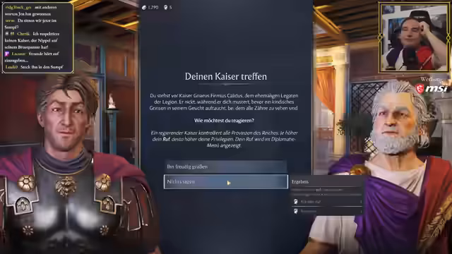 05:53:33Eine Seuche bricht im Sumpf aus, was den Bau teurer Ärzte erfordert. Bei der Begegnung mit dem Kaiser gibt es eine Abstimmung, ob man ihn grüßen oder nicht. Der Streamer appelliert an die Chats, dem Kaiser zu schmeicheln, um negative Konsequenzen zu vermeiden. Er gibt zu, seine Chats gezielt zu manipulieren, um den Chat zugunsten von Jen, die die Figur der missverstandenen Piratenheldin spielt, zu beeinflussen.