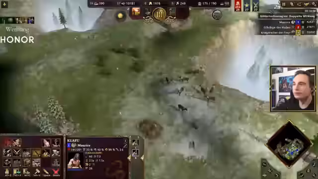 02:16:38Maurice äußert sich positiv über das neue Volk in Age of Mythology und dessen Fähigkeiten. Er vermutet, dass der Nebel auf der Karte zur mystischen Atmosphäre beiträgt und möglicherweise Einheiten vor Angriffen schützt. Er gibt an, langsam ein Gefühl für den Anfang des Spiels und die Build Order (BO) zu entwickeln, insbesondere im Hinblick auf den Einsatz von Riesenarbeitern. Er kritisiert das "Autoscouting" im Spiel als unintelligent und ärgerlich. Er bemerkt, dass sterbende Lebensbauarbeiter keine lauten Geräusche machen. Es wird eine kurze Pause eingelegt, während Maurice feststellt, dass er vier arbeitslose Einheiten hat, was er auf Nahrungsmangel zurückführt. Er kündigt an, erneut Autoscouting zu betreiben und zu beobachten, ob der Scout wieder zu Sepp geht, was er als "full Sepp" bezeichnet. Er kommentiert, dass der Gegner Gebäude sehr schnell baut und plant, seine Position zu sichern. Er bereitet einen Angriff auf Sepp vor und äußert Zweifel an der Anzahl der Bogenschützen des Gegners.