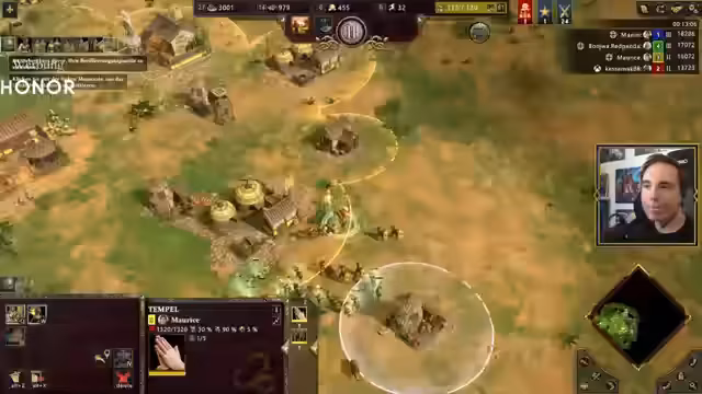 00:29:12Das Spiel beginnt und es kommt zu ersten Angriffen. Maurice wird von seinem Nachbarn, vermutlich Maxim, attackiert. Es wird festgestellt, dass jeder Gott einen Bonus hat, der sich auf das jeweilige Volk auswirkt. Leon ist trotz mangelnder Erfahrung schnell im zweiten Zeitalter. Die Spieler diskutieren über die Möglichkeit eines gemeinsamen Chats, verwerfen die Idee jedoch aufgrund des FFA-Charakters des Spiels. Maurice ist von den neuen Mechaniken überfordert. Es kommt zu ersten Todesfällen und Schuldzuweisungen. Leon wird als 'Schweiz' bezeichnet, während Maurice beschuldigt wird, 'gewebert' zu haben. Die Spieler testen die verschiedenen Einheiten und Fähigkeiten der Chinesen. Es wird festgestellt, dass Maxim ein aggressiver Rusher ist. Maurice hat Schwierigkeiten, seine Ressourcen zu balancieren. Es bilden sich erste Allianzen gegen Maxim, der als Kriegstreiber wahrgenommen wird. Die Spieler tauschen sich über Strategien und Taktiken aus, wobei Leon Ratschläge gibt.