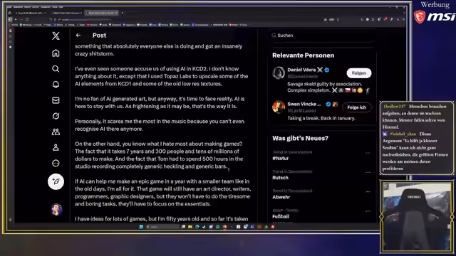 03:51:29Der Streamer diskutiert den umstrittenen Einsatz von KI in der Spielebranche, besonders bei Studios wie Larian. Er betont, dass viele Entwickler KI als Werkzeug zur Unterstützung nutzen, etwa für Konzeptarbeit oder Ideenfindung. Dabei wird erwähnt, dass Hideo Kojima KI als Hilfsmittel sieht, das repetitive Aufgaben übernehmen kann. Kritisch hinterfragt wird jedoch, ob KI den kreativen Prozess einschränkt, wenn sie zu sehr als Vorlage genutzt wird – insbesondere bei urheberrechtlichen und ethischen Aspekten, da Trainingsdaten oft ohne Zustimmung der Künstler verwendet werden.