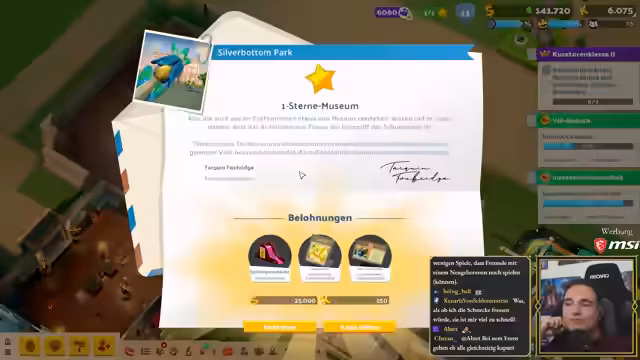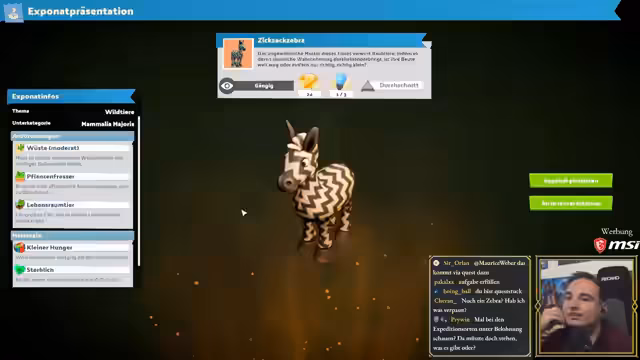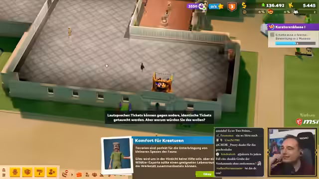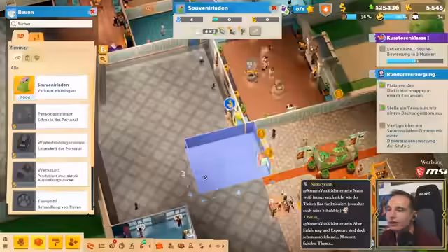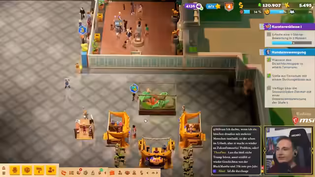 04:47:01Während des Aufbaus des 'Silverbottom Park'-Museums testet der Streamer die Twitch-Integration, die es Zuschauer*innen ermöglicht, Einfluss auf das Spiel zu nehmen. Er experimentiert mit dem Fantasy-DLC, um dem Zoo einen märchenhaften Anstrich zu verleihen, und diskutiert die Mechaniken hinter Terrarien und Tierhaltung. Humorvolle Elemente wie absurde Ausstellungstexte und chaotische Events (z.B. Schädlingsbefall) unterstreichen den typischen Charme des Spiels, während strategische Entscheidungen zur Raumgestaltung getroffen werden.