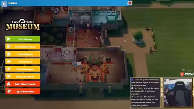 04:33:22Nach der Diskussion wechselt der Streamer zum gesponserten Gameplay von 'Two Point Museum'. Er stellt den neuen Zoo-DLC vor, der im Steam-Winter-Sale erhältlich ist, und betont den charakteristischen Humor der Two-Point-Reihe. Das Spielprinzip wird erklärt: Spieler*innen bauen ein Museum mit interaktiven Exponaten, wobei der Fokus auf dem Aufbau von Tiergehegen und Besucherinfrastruktur liegt. Der Streamer beginnt mit der Gestaltung des Eingangsbereichs, platziert Ticketschalter und stellt Personal ein, während Twitch-Zuschauer*innen via Integration Events auslösen können.