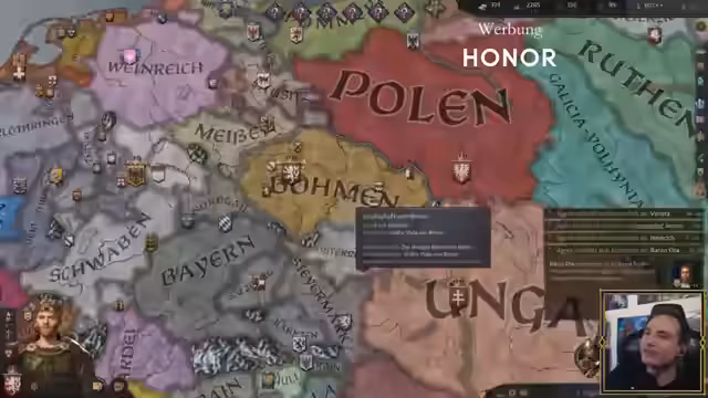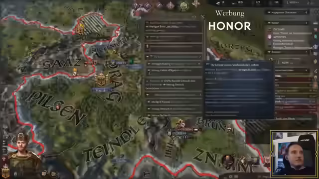 03:31:47Gemeinsam mit Verbündeten setzt der Streamer den Krieg gegen den Kaiser fort und erobertr die Hauptstadt des Heiligen Römischen Reichs. Er krönt sich selbst zum König von Böhmen. Gleichzeitig versucht er, seinen militärischen Aufwand zu optimieren und Truppen koordiniert einzusetzen.