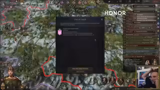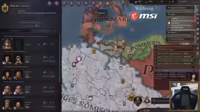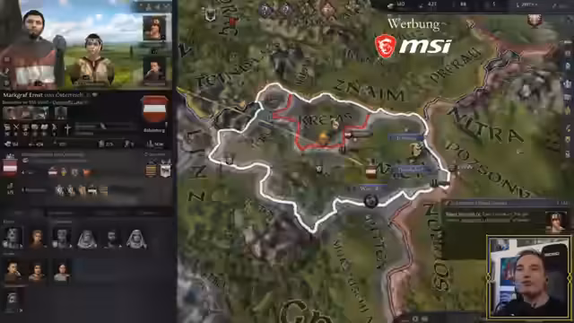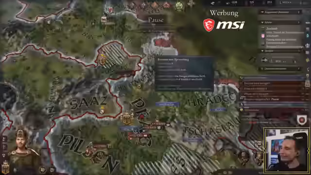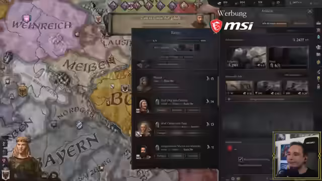 05:03:24Der Hauptfokus des Streams liegt auf dem Strategiespiel Crusader Kings 3, wo die Spieler ihre Reiche verwalten und Kriege führen. Der österreichische Herrscher stellt eine Bedrohung dar und wird als 'Halunke' bezeichnet. Die Spieler strategisieren über militärische Aktionen, Belagerungen und mögliche Waffenstillstände, während sie versuchen, ihre Territorien zu verteidigen und auszubauen.