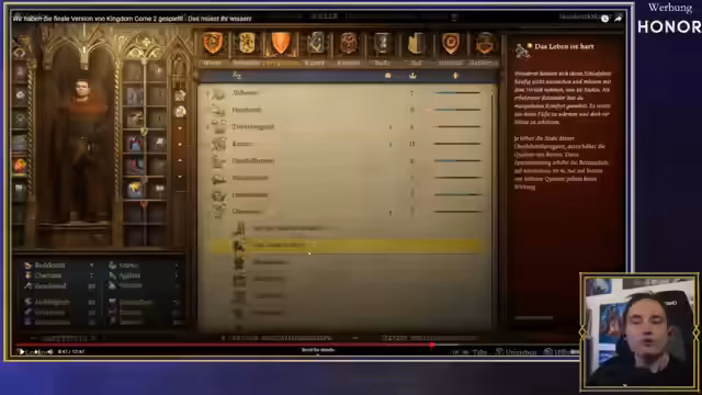 00:32:09Zum technischen Zustand des Spiels äußert sich der Streamer positiv: Auf Xbox Series X laufe der Performance-Modus stabil, auf PC butterweich. Er lobt die detaillierten Systeme wie Alchemie und Schmieden, die jedoch auch entschleunigend wirken. Die Charakterentwicklung über Perks wird als bedeutend für den Spielstil beschrieben, wobei bestimmte Perks im Vergleich zum ersten Teil verbessert wurden. Der Verlust von Heinrichs Hund zu Beginn und dessen langsame Wiederauffindung wird als langwierige Quest erwähnt.
