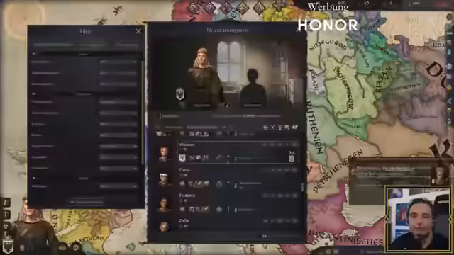 02:08:52Die Beziehungen zu anderen Herrschern und die Heiratspolitik dominieren die aktuelle Spielphase. Jen diskutiert über die Vor- und Nachteile von Landlosen Ehepartnern und versucht, Rodrigo als Ehemann zu gewinnen. Maurice nutzt diplomatische Fertigkeiten, um Köln seinem Reich einzugliedern. Währenddessen entstehen Spannungen mit den Vasallen und die ersten politischen Manöver werden eingeleitet. Auch die eigene Erbfolge wird gesichert.
