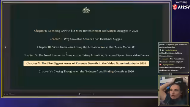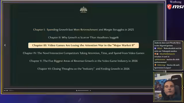 00:39:40Nach technischen Einstellungen beginnt der Stream mit der angekündigten Analyse der Gaming-Branche. Er nutzt dazu die Präsentation "State of Video Gaming in 2026" von Analyst Matthew Ball. Laut dieser hat sich der globale Markt von 1990 bis heute auf fast 200 Milliarden US-Dollar mehr als verneunfacht. Das enorme Wachstum nach der Corona-Pandemie hat sich jedoch nicht fortgesetzt, was zu massiven Kürzungen bei den Investitionen in Spieleentwicklung, Schließungen von Studios und Entlassungen von Mitarbeitern führt.