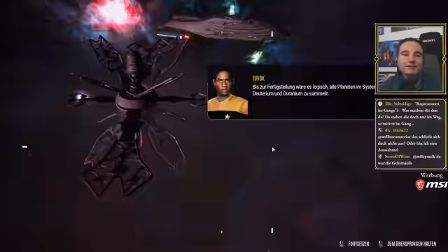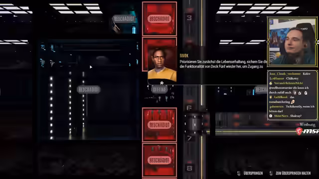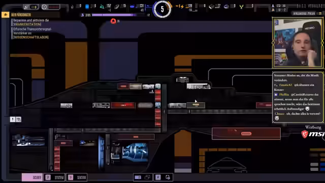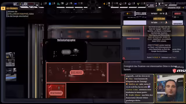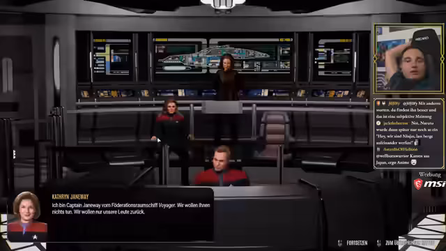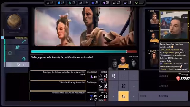 04:10:16Das Hauptthema ist das Spiel "Star Trek: Adventures". Der Streamer übernimmt die Rolle des Captains der USS Voyager. Der Fokus liegt auf der Verwaltung des Schiffs: Crew-Moral ist ein zentrales Thema, Entscheidungen beeinflussen das Wohlbefinden. Ressourcen wie Deuterium und Duranium müssen gesammelt und Räume repariert werden. Besonders hervorgehoben wird der Balanceakt zwischen der Bereitstellung von "Premium-Rationen" zur Moralsteigerung und dem Verbrauch knapper Ressourcen.
