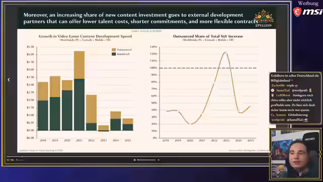 01:48:32Die Börsenpreise für Spielefirmen seit 2023 zeigen extreme Unterschiede. Während Roblox und Take-Two (u.a. GTA 5) um über 200% gestiegen sind, haben Ubisoft und Embracer katastrophale Verluste von -78% bzw. -82% erlitten. Nur wenige Unternehmen wie Konami und Roblox schlugen den Industriestandard S&P 500. Dies spiegelt wider, dass nur etablierte Top-Marken und Nischenanbieter profitabel sind.