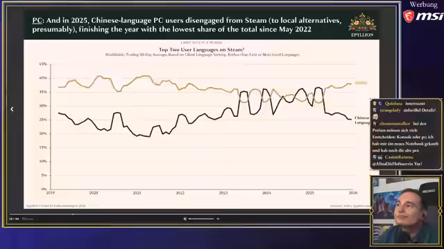 01:29:33Der westliche Gaming-Markt außerhalb Chinas ist seit 2020 weitgehend stagniert, trotz Wachstum vor 2019. Dies zeigt, dass die klassischen Märkte in den USA, Japan, Südkorea und Europa gesättigt sind. Gleichzeitig hat sich die Zahl der Spiele-Releases massiv erhöht, von 8000 auf 20.000 auf Steam von 2019 bis 2025, was den Wettbewerb und die Konkurrenz für neue Titel explodieren lässt.