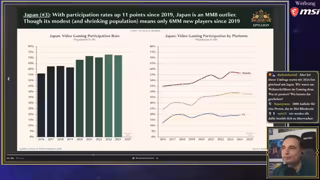 02:02:50In wichtigen westlichen Märkten sinkt die Zahl der Gamer. In den USA fiel der Anteil von über 80% im Jahr 2020 auf 72% im Jahr 2024. Auch in Kanada, Südkorea, England und Italien ist seit Jahren ein Rückgang zu verzeichnen. Nur in Deutschland und Japan ist eine positive Tendenz erkennbar. Dieser Rückgang bei der Spielerbasis verschärft das Problem der gesättigten Märkte und macht es für neue Produkte schwieriger, erfolgreich zu sein.