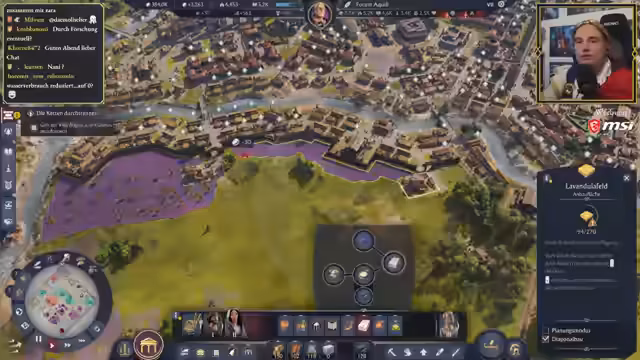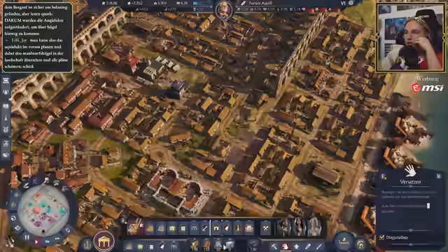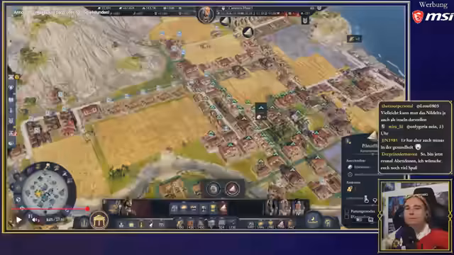 05:36:53Im weiteren Verlauf des Streames beschäftigt sich der Spieler mit der Entwicklung seiner römischen Stadt. Er optimiert seine Produktionsketten, insbesondere die Landwirtschaft, indem er Aquädukte und den Bonus der Göttin Keres nutzt. Er experimentiert mit der Anordnung von Farmen und Produktionsgebäuden, um die Effizienz zu maximieren. Dabei stellt er fest, dass das Platzieren von Farmen in Form von 'Spaghetti-Feldern' zwar praktisch ist, optisch aber nicht ideal. Gleichzeitig muss er mit Problemen wie Piratenangriffen und unzureichenden Sicherheitsgebäuden kämpfen.
