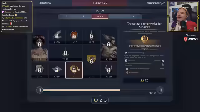 04:14:29Der Streamer stößt an die Grenzen seiner historischen Kenntnisse bezüglich der asiatischen Epoche und Roms Fortschritte in dieser Zeit. Im Spiel kann das Fenster zur Lüftung geöffnet werden, wenn es zu warm wird in der Toga. Interessanterweise funktioniert die Schaltfläche zum Beenden des Spiels nicht. Der Streamer möchte das Gameplay und das Spiel mit den Zuschauern gemeinsam erkunden und dabei essen.