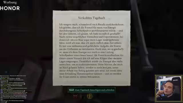 03:12:01Der Fokus liegt auf der Verfolgung von Quests, wie der Suche nach einer Schatzkarte und die Erforschung von Orten, die durch Notizen und Dialoge im Spiel bestimmt werden. Die Story wird durch Interaktion mit NPCs und das Lesen von Dokumenten vorangetrieben. Dabei wird das Thema der 'Traumgeißel' erkundet, das die Hauptquest antreibt. Der Streamer betont, dass die Welt reaktiv auf Entscheidungen des Spielers reagiert, was die Immersion fördert und die Story vertieft.