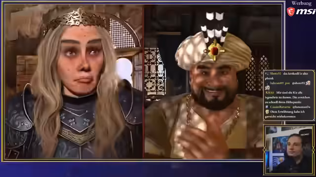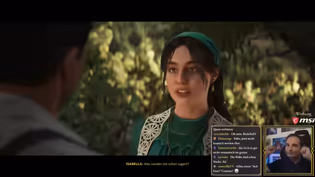 04:37:46Die Charaktere arbeiten sich von der untersten Stufe hoch und übernehmen Aufgaben wie Stall ausmisten und bei der Vorbereitung von Festmahlen zu helfen. Der Streamer vergleicht dies humorvoll mit anderen Spielen wie Kingdom Come. Gleichzeitig zeigt sich der Charakter Enzo von Don Toris Tochter Isabella angetan und beginnt, sie zu beobachten, was zu Spannungen und Warnungen vonseiten anderer Charaktere führt.