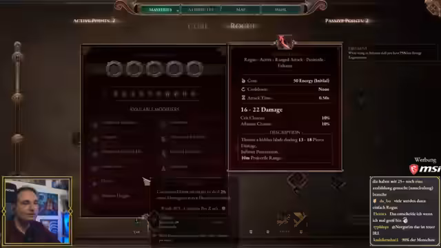 05:27:15Der Streamer erkundet das Skill-System des Spiels intensiv. Er experimentiert mit der Kombination von zwei Dolchen, um mehr Angriffsgeschwindigkeit zu erzielen, und analysiert den DPS. Er entscheidet sich, Attribute primär auf Agilität zu legen, um Schaden und Kritische Treffer zu erhöhen. Besonders fasziniert ist er von der Flexibilität der Fähigkeiten, da der normale Nahkampfangriff und die Ausweichrolle wie Fähigkeiten angepasst werden können. Er entdeckt, dass er durch das Generieren von 'Flow' mit seinen Angriffen seinen Teleportschlag ohne Cooldown einsetzen kann, was sein bevorzugtes Gameplay-Konzept ist.