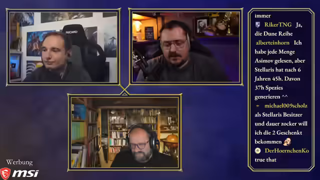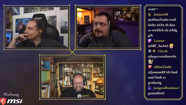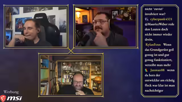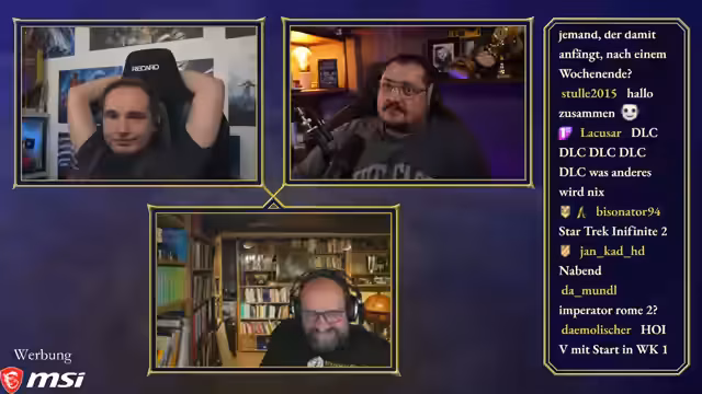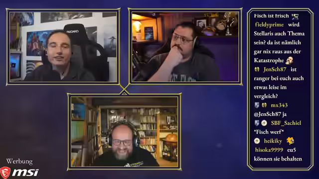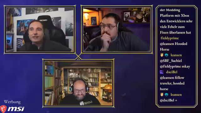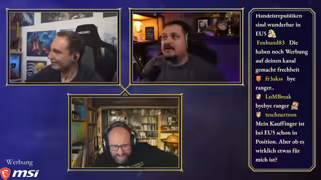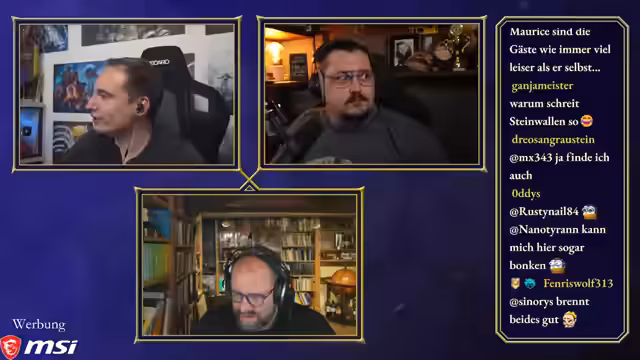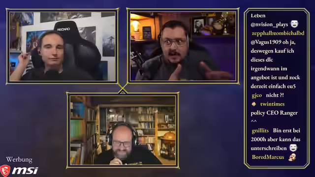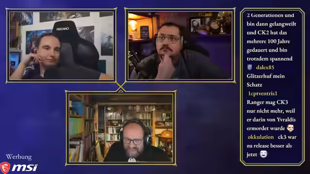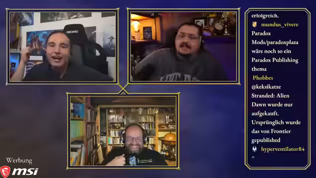 00:50:03Maurice, Steinwallen und Ranger bereiten sich auf die 'Ehrenrunde' vor, wobei technische Details wie Audiopegel und separate Tonaufnahmen besprochen werden. Maurice hatte versucht, ein neues Mikrofon zu verwenden, musste aber feststellen, dass es für seinen großen Raum ungeeignet ist, was ihn dazu zwingt, bei seinem alten Setup zu bleiben. Die Diskussion über einen gemeinsamen Chat für die Communities von Maurice und Steinwallen zeigt unterschiedliche Meinungen, wobei Steinwallen und Ranger Bedenken wegen des potenziellen Stresses und der unterschiedlichen Chat-Dynamiken äußern. Ranger schlägt vor, dass sie als 'Transmitter' die Kommunikation besser kontrollieren können. Maurice stellt fest, dass die Ranger-Community sich nun auf seinen und Steinwallens Chat aufteilt, da Ranger selbst nicht live ist. Die Moderation des Podcasts beginnt, und Maurice leitet die Diskussion ein, indem er die beiden Hauptfragen des Abends formuliert: den Status des Publishing-Arms von Paradox und die Akzeptanz ihrer Kernspiele und DLCs in der Community.