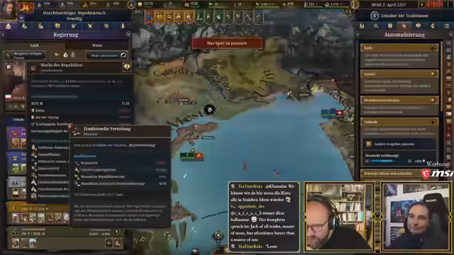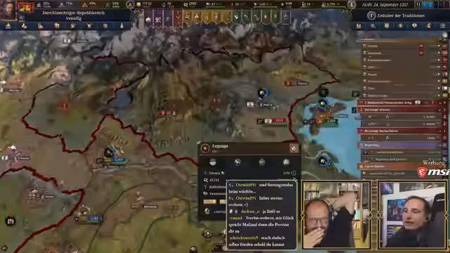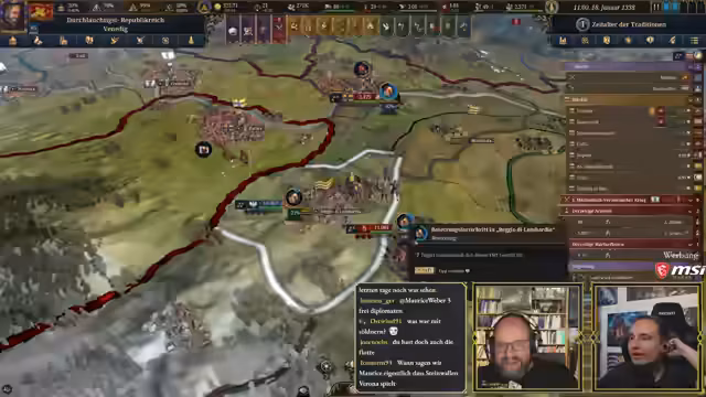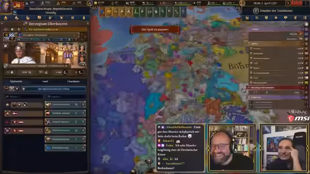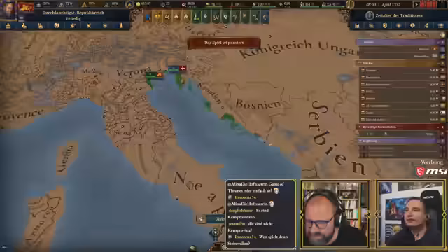 03:33:51Maurice reflektiert seine Wahl Venedigs und erklärt, dass er sich an Steinwallens Maxime gehalten hat, eine Nation zu wählen, die mächtig genug ist, um handlungsfähig zu sein, aber nicht so groß, dass sie unüberschaubar wird. Er erwähnt scherzhaft, dass er gerne mit Oberbayern gestartet hätte, aber dies als Kaiser für eine erste EU5-Runde suboptimal wäre. Steinwallen macht Maurice auf die Eigenschaften des oberbayerischen Kaisers Ludwig IV. aufmerksam, der den Perk 'Schwätzender Schwachkopf' besitzt, was zu erheblichen diplomatischen Nachteilen führt und für Belustigung sorgt. Maurice hingegen spielt mit Doge Francesco Dandolo von Venedig, einem 79-jährigen Herrscher mit der Eigenschaft 'verhandlungsstark', jedoch nur einer von drei möglichen Eigenschaften. Es wird befürchtet, dass der Doge aufgrund seines hohen Alters bald sterben könnte, und die Besonderheiten einer Republik, in der der Doge gewählt wird, werden hervorgehoben. Die bevorstehende Pest in neun bis zehn Jahren wird ebenfalls als Herausforderung genannt. Steinwallen, als Vasall Konsul Filippo von Ragusa, wird vorgestellt. Die Startagenda Venedigs weist auf potenzielle Feinde wie Byzanz und andere italienische Mächte hin. Die Qualität der deutschen Ländernamen im Spiel wird kritisiert, da sie oft absurd klingen und auf Englisch besser funktionieren.