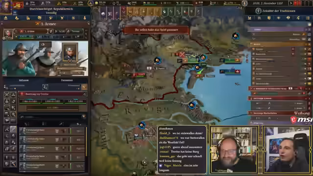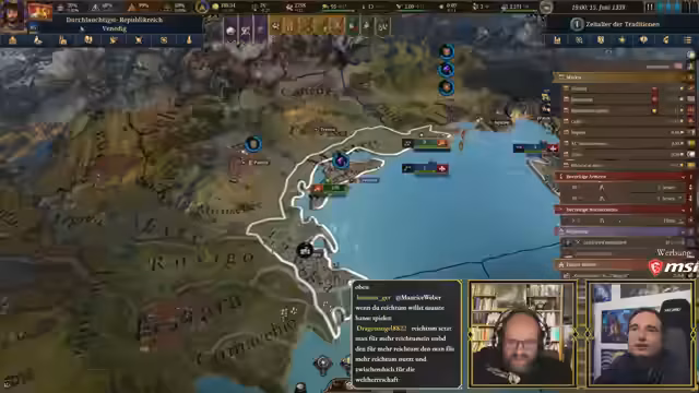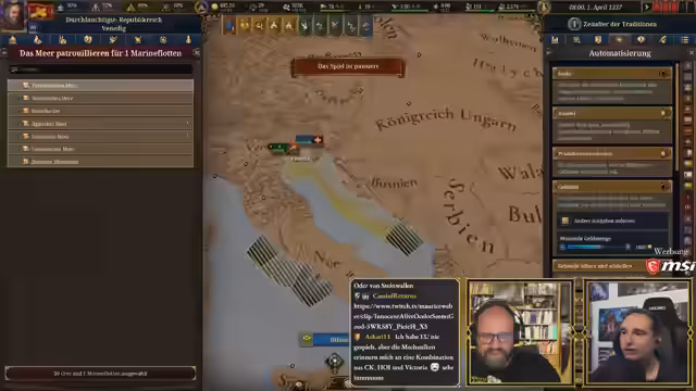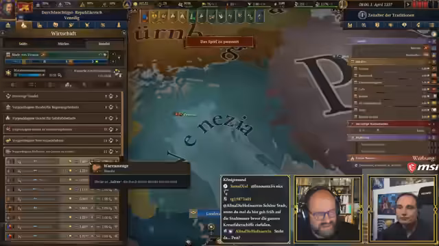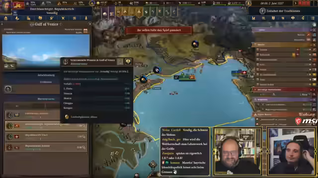 00:10:19Der Stream beginnt mit der Ankündigung der heutigen 'Ehrenrunde', die um 18 Uhr mit Steinwallen und Ranger stattfindet, um über den aktuellen Status von Paradox zu sprechen. Im Anschluss daran ist eine Europa Universalis 5 (EU5) Session geplant. Steinwallen hat angeboten, Maurice Weber in einer Koop-Partie zu unterstützen und ihm das Spiel zu erklären. Maurice Weber ist begeistert von dieser Idee und freut sich auf die gemeinsame Session. Sie haben sich für Venedig als Startnation entschieden, da diese Nation eine gute Balance zwischen Größe, Macht und überschaubaren Mechaniken bietet, was sie ideal für einen Neueinsteiger macht. Maurice hatte auch andere Nationen wie Luxemburg oder Oberbayern in Betracht gezogen, diese aber aufgrund ihrer komplexen Startbedingungen (Personalunion mit Böhmen, Rolle als römischer Kaiser im Heiligen Römischen Reich) für den ersten Durchlauf als ungeeignet empfunden. Venedig hingegen bietet eine interessante historische und spielerische Atmosphäre als kapitalistische Handelsmacht mit eigenem Content, was Maurice als passend und lustig empfindet.