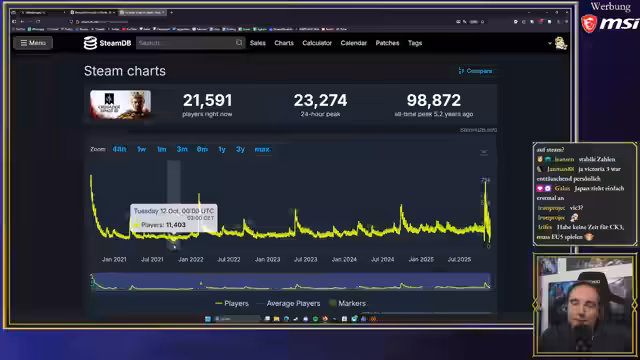 00:22:17Maurice Weber recherchiert die aktuellen Spielerzahlen von Paradox-Spielen, um die Diskussion in der Ehrenrunde vorzubereiten. Europa Universalis 5 (EU5) zeigt sich mit einem All-Time-Peak von 77.000 Spielern zum Release als erfolgreich, obwohl es komplexer ist als Crusader Kings 3 (CK3), welches fast 100.000 Spieler erreichte. CK3 läuft stabil mit 20.000-24.000 Spielern und profitiert von DLCs, die die Langzeitspielerbindung erhöhen. Victoria 3 hingegen schneidet schlechter ab, mit einem ähnlichen Launch-Peak wie EU5, aber deutlich weniger verbleibenden Spielern (ca. 6.000). Maurice vermutet, dass EU5 Victoria 3 Spieler abzieht, da es ebenfalls Gebäude- und Handelsmechaniken bietet. Hearts of Iron bleibt das erfolgreichste Paradox-Spiel mit 50.000 aktuellen Spielern und stetigem Wachstum. Cities: Skylines 1 hat sich 12 Millionen Mal verkauft, was die Bedeutung der Marke unterstreicht. Cities: Skylines 2 hatte einen beeindruckenden Release-Peak von 104.000 Spielern, konnte diese jedoch aufgrund von Performance-Problemen und anderen Mängeln nicht halten, was Maurice als verpasste Chance für Paradox bewertet.