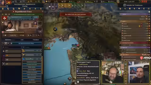 04:19:51Die Untreue des Republikreichs Ragusa wird als Problem identifiziert, da es sich nicht den Kriegen Venedigs anschließen will. Um die Loyalität zu erhöhen, wird vorgeschlagen, die Diplomatieausgaben zu erhöhen, was sich direkt auf die Treue der Klientelländer auswirkt. Eine Erhöhung auf das Maximum steigert die Loyalität um plus 30, was als kostengünstige Lösung angesehen wird. Parallel dazu entfaltet sich die politische Landschaft Italiens mit dem Konflikt zwischen Gülfen und Gebellinen, die um die Vorherrschaft kämpfen. Venedig muss sich entscheiden, ob es den Kirchenstaat oder den Kaiser unterstützt. Historisch gesehen war Venedig lange Zeit neutral, doch die Entscheidung fällt zugunsten der Gebellinen, die den Kaiser unterstützen, obwohl dies bedeutet, gegen Verona vorzugehen, das ebenfalls den Gebellinen zugetan ist. Es wird argumentiert, dass Verona als schwacher Gebelline, der seine eigenen Vasallen nicht kontrollieren kann, keine Schande für den Kaiser darstellt. Die Mitgliedschaft in einer Liga ermöglicht es, Kriegsgründe in Italien ohne Parlament zu generieren, was strategische Vorteile bietet.
