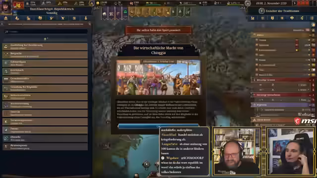 05:33:22Nach der Verwüstung Venedigs durch den Krieg wird ein Kabinettsauftrag zur Erholung der Region erteilt, um die negativen Auswirkungen auf die Einnahmen zu minimindern. Diese Maßnahme ist entscheidend für die schnelle Wiederherstellung der Wirtschaft. Die Stärkung von Bürgern und Händlern auf Kosten des Landadels wird in Kauf genommen, um den Handel zu maximieren, auch wenn dies Prestige kostet. Der automatische Handel wird als effizient für die Maximierung des Gewinns angesehen, während strategischer Handel für spezifische Ressourcen später relevant wird. Die Marktkapazität in Venedig soll weiter ausgebaut werden, solange die Handelsrouten solide Gewinne erzielen. Die Möglichkeit, in anderen Ländern Handelsposten zu errichten, wird als zukünftige Option zur Erweiterung der Marktmacht genannt. Die Annexion von Triest wird in Betracht gezogen, auch wenn dies den Klientelländern missfällt. Ein Parlament wird einberufen, um über Marineinfrastruktur und Entwicklung zu debattieren, wobei die Wahl zwischen den Forderungen der Stände und eigenen Gesetzesänderungen abgewogen wird.
