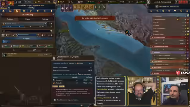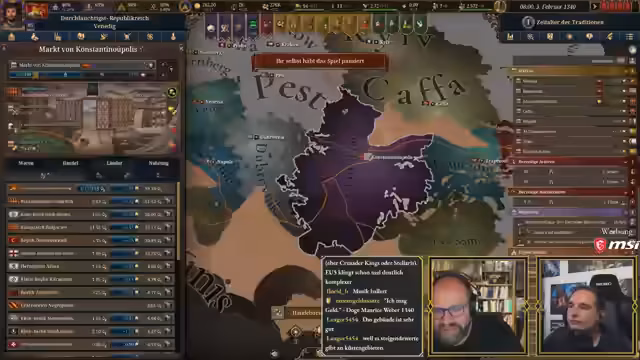 04:05:59Die Diskussion dreht sich um die Expansion Venedigs, wobei Bosnien als nächster logischer Schritt ins Auge gefasst wird, da es strategisch günstig liegt und Venedig militärisch überlegen ist. Eine mögliche Personalunion zwischen Ungarn und Kroatien wird als potenzielles Problem erkannt, da dies die Expansion erschweren könnte. Parallel dazu werden erste Investitionen in Venedig selbst geplant. Der Bau einer Juwelierszunft wird als profitable Investition identifiziert, die 200 Bürger beschäftigt und sechs Profitpunkte generiert. Auch in Chiojia, mit 94% Kontrolle und 2000 Bürgern, sollen ähnliche Handwerksbetriebe errichtet werden. Langfristig wird auch der Ausbau des Marktplatzes in Venedig in Betracht gezogen, um die Handelskapazität zu erhöhen, was für eine Handelsrepublik von großer Bedeutung ist. Die Priorität liegt jedoch zunächst auf den Handwerksbetrieben, um schnellstmöglich Gewinne zu erzielen.