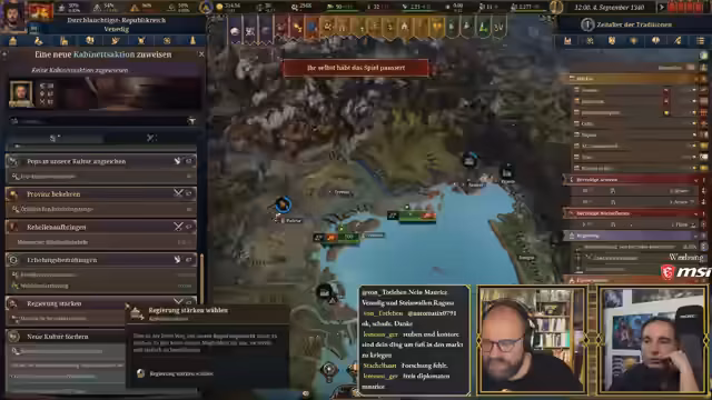 03:51:56Maurice besetzt die Kabinettsposten, um die Stabilität des Landes zu erhöhen und die Regierung zu stärken. Er wählt zwei Allrounder mit guten Militär- und Diplomatie-Werten, um flexibel agieren zu können. Es wird darauf hingewiesen, dass das Wechseln von Kabinettsmitgliedern Kosten verursacht. Die Diskussion geht über zu den Ständen, die in EU5 eine wichtige Rolle spielen. Die Republikmacht Venedigs ist mit 14% gering, während die Bürger (Citadini) 44% der Macht besitzen und sehr zufrieden sind. Der gemeine Stand hat trotz seiner Größe nur 4% der Macht. Ziel ist es, die Macht der Regierung zu erhöhen und die Privilegien der Stände, insbesondere der Adligen, zu reduzieren. Ein Privileg der Adligen, das die Kronenmacht um 25% reduziert, soll entzogen werden, sobald die Stabilität hoch genug ist, um die negativen Auswirkungen auf die Standeszufriedenheit abzufedern. Dies erfordert eine sorgfältige Planung, da es zu einem Bürgerkrieg führen könnte. Maurice und Steinwallen leiten zur Außenpolitik über, da das Prestige Venedigs sinkt und Rivalen festgelegt werden müssen. Maurice kann zwei weitere Rivalen wählen. Steinwallen schlägt Verona als Rivalen vor, da es im ersten Jahr ein Event gegen sie geben wird, obwohl Venedig schwächer ist. Alternativ wird Ferrara als schwächeres Ziel genannt, jedoch ist Venedig auch ihnen nicht gewachsen. Letztendlich wird Kroatien als Rivale gewählt, da Venedig wesentlich stärker ist und Kroatien Venedig hasst, was eine gute Gelegenheit bietet, die eigenen Besitztümer zu konsolidieren.