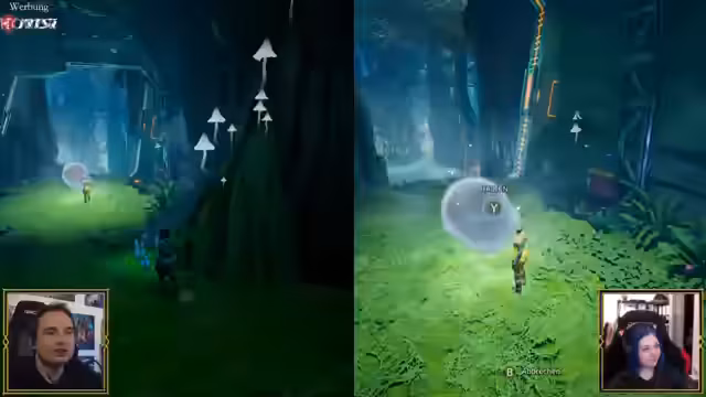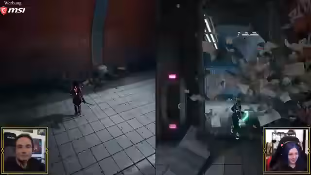 00:41:40Nach erfolgreichem Start von 'Split Fiction' müssen sich Maurice und Mary für eine der beiden Hauptautorinnen entscheiden, deren Rolle sie übernehmen. Der Chat wird in die Wahl eingebunden und Maurice entscheidet sich für den Sci-Fi-Autor Mio Hudson. Das Tutorial beginnt mit einer klassischen Jump'n'Run-Sequenz, die den spielerischen Unterschied zwischen den beiden Charakteren sofort klar macht. Maurice muss Mary durch eine First-Person-Passage leiten, was zu ersten humorvollen Missverständnissen und dem ersten Tode im Spiel führt. Das Tutorial zeigt bereits die Grundzüge der Kooperation und den Genre-Mix des Spiels.