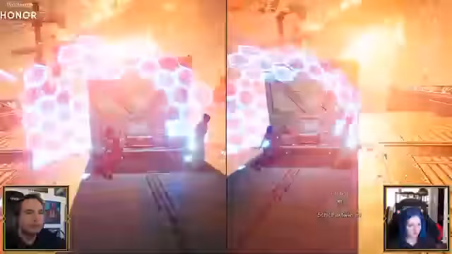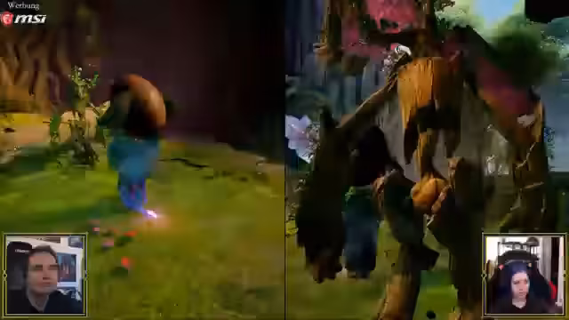 01:13:20Nachdem der erste Teil des Spiels, der in Maurice' Sci-Fi-Welt spielt, absolviert ist, wechselt die Szene in Marys Fantasy-Geschichte. Das Gameplay und die Ästhetik ändern sich dramatisch: von einer futuristischen Anlage zu einer mittelalterlichen Burg, die von Trollen belagert wird. Die Koop-Mechaniken werden komplexer, indem sie unterschiedliche Fähigkeiten und Interaktionsmöglichkeiten einführen. Maurice muss Mary durch einen gefahrvollen Parcours leiten, während sie gleichzeitig das Spielgeschehen kommentieren und dabei die skurrilen und chaotischen Situationen humoristisch bewerten, was den spielerischen Charme des Titels unterstreicht.