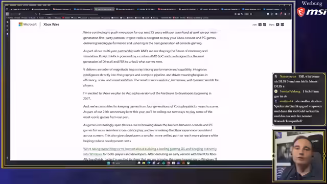02:56:34Die Diskussion endet mit einem Ausblick auf die Zukunft der Grafik. Die neue Xbox wird stark auf FSA-Upscaling setzen, anstatt auf nativ hohe Auflösungen zu setzen. Der Streamer merkt an, dass Upscaling-Technologien in der Zwischenzeit sehr bemerkenswert und ausgereift geworden sind. Die Ziele von Microsoft und Sony sind dabei klar: Sie wollen eine High-End-Erfahrung zu einem möglichst wettbewerbsfähigen Preis anbieten, was eine große technische und finanzielle Herausforderung darstellt.