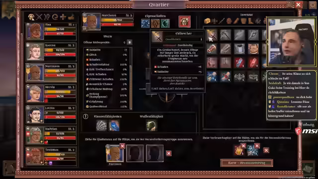 04:25:44Der Streamer führt seine Truppe durch Kämpfe in der Arena, wobei er Taktiken wie den Klingenschprung und Positionierung nutzt. Ein schwerer Kampf gegen eine Gift-Spinne und Gegner auf einem heiligen Boden erfordert präzises Manövrieren, um Schaden zu minimieren und Gegner mit Bluten zu besiegen. Nach erfolgreichen Kämpfen erhält man Belohnungen wie Pseudomedizin, die heilt, aber schwächt, und neue Ausrüstung. Die Herausforderung ist, die verschiedenen Statuseffekte wie Gift, Blutung und Rüstungsreduktion zu managen, während man gleichzeitig die Aufgaben des Publikums erfüllt.