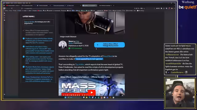 01:41:33Es gibt Meldungen, dass Amazon die 'Mass Effect'-Serie umschreiben möchte, um sie attraktiver für ein breiteres Publikum zu machen und nicht nur für Fans der Spiele. Der Streamer zögert, dies eindeutig zu bewerten, da das Scheitern von Serien-Adaptionen oft an der mangelnden Achtung vor dem Originalmedium liegt. Er vergleicht das mit anderen Umsetzungen: 'The Witcher' sei keine direkte Spiel-Adaption, während 'The Expanse' eine sehr gute Serie war, die ein breiteres Publikum ansprach. Der Streamer ist unsicher, ob der Fokus der Serie auf Story oder reine In-Jokes liegen wird, und betont, dass viele Adaptionen von Game-Fans kritisch gesehen werden, da sie das Spiel nicht respektieren.