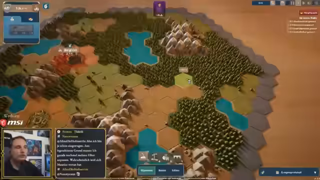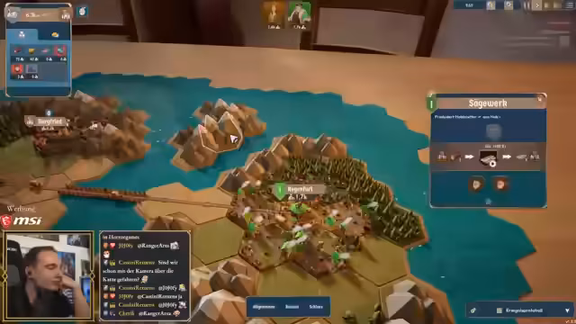 00:47:14Der Streamer startet in das Tutorial, um die Spielmechanik zu demonstrieren. Er baut ein Sägewerk, nicht im Dorf, das Holz produziert, sondern im Dorf, das Kartoffeln anbaut, um den Handel und somit die Einnahmen zu maximieren. Er versucht, eine Kaserne zu erforschen, stößt aber auf ein Problem: ihm fehlen die notwendigen Ressourcen wie Stein. Dies führt zu einer humorvollen und vermeintlichen Katastrophe, bei der der Streamer zunächst überfordert scheint, später aber herausfindet, dass das Spiel ihm fehlende Ressourcen für das Tutorial automatisch zur Verfügung stellt.