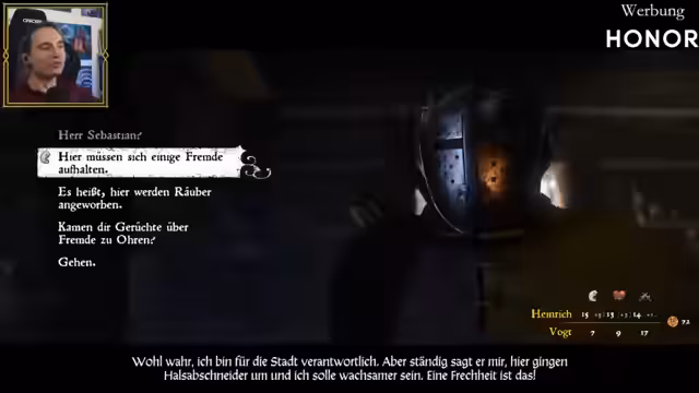 00:31:11Der Streamer äußert seinen Unmut darüber, dass er eine Quest nicht abschließen kann, ohne einem schurkischen Schmied zu helfen, und wünscht sich die Option, dies zu verweigern. Er interpretiert die Situation so, dass er den Schmied mit einer Halbwahrheit in die Irre führt. Er stellt fest, dass er dem Hauptquestschild hinterhergerannt ist und sich verirrt hat. Er diskutiert die Möglichkeit, die Freundschaft mit Fritz und Matthäus zu beenden, da er sie als toxisch empfindet. Er findet heraus, dass Fritz und Matthäus Stress mit Thomas, Elias, dem Müller und dessen Tochter haben. Er trifft auf den Vormann Thomas, der anscheinend gerade mit einem Mädchen im Bad ist, und beschließt, ihn später anzusprechen. Stattdessen sucht er ein Gasthaus für die Nacht. Am nächsten Morgen ist er immer noch geneigt, Fritz und Matthäus hinter sich zu lassen, obwohl er sich fragt, ob Hans wirklich ein besserer Freund ist. Er stellt fest, dass sein Heinrich kaum schlafen muss und fragt sich, wie andere Leute den Tag über genug Energie verbrauchen.