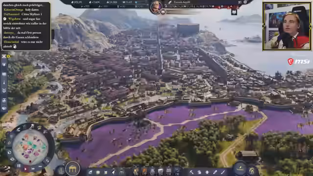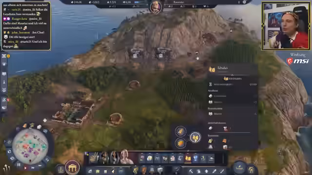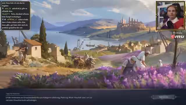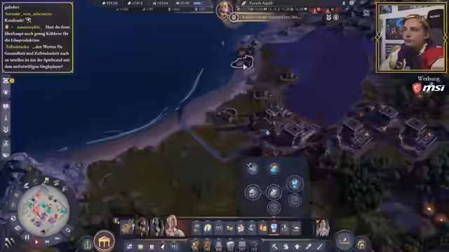 01:09:20Der Streamer beginnt mit dem Gameplay in seiner Anno-117-Stadt. Er konfrontiert die anhaltenden Probleme mit unzufriedener und kranker Bevölkerung, obwohl die Versorgung mit Nahrung und Brandsicherheit weitgehend gesichert ist. Er identifiziert, dass fehlende Güter wie Fisch und Wein für die Zufriedenheit entscheidend sind. Um die Bevölkerung zu versorgen, beginnt er, Arbeitslagerinseln aufzubauen, um die Bevölkerung in die Marmor- und Mineralminen zu schicken. Es stellt sich jedoch heraus, dass das für die Togen benötigte Gut Flax auf der Insel fehlt und es anscheinend kaum verfügbar ist, was zu einer neuen Herausforderung wird.