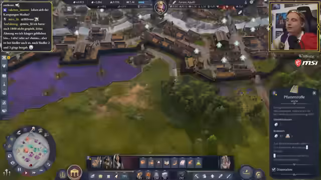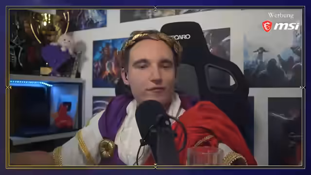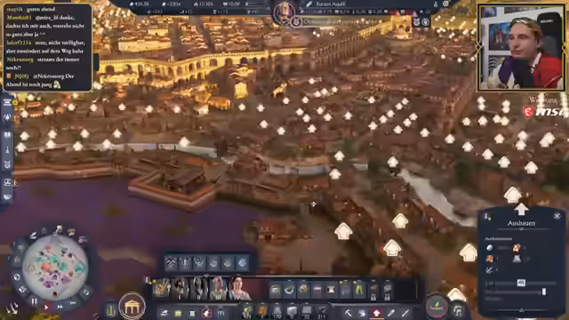 07:12:07Ein Zuschauer, der den Stream per "Raid" besucht, erhält einen semi-historischen Kontext zum Spiel. Die im Stream getragene Toga wird als nicht historisch korrektes, aber passendes Cosplay der Spiel-Kaiserfigur beschrieben. In der Gameplay-Diskussion vergleicht der Streamer seine Bauweise, die sich an Naturgrenzen orientiert, mit anderen Strategien wie dem reinen Effizienzbau oder dem Bau um zentrale Objekte. Er räumt ein, dass er oft in seinem alten "Schachbrett"-Schema verfällt, was aber aufwendiger sei.