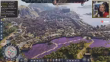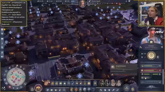 Für den Bau des Amphitheaters werden weitere Ressourcen wie Holz, Beton und Seil benötigt. Die Stadt wird ausgebaut, um die notwendige Arbeitskraft zu generieren. Es werden öffentliche Unruhen erwähnt, aber die Wirtschaft stabilisiert sich durch die Weinexporte nach Albion, die den Streamer reich machen. Der Streamer bemerkt, dass Ubisofts Aktie wegen des gestoppten Halbjahresberichts gehandelt wird, was er kritisch sieht.