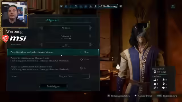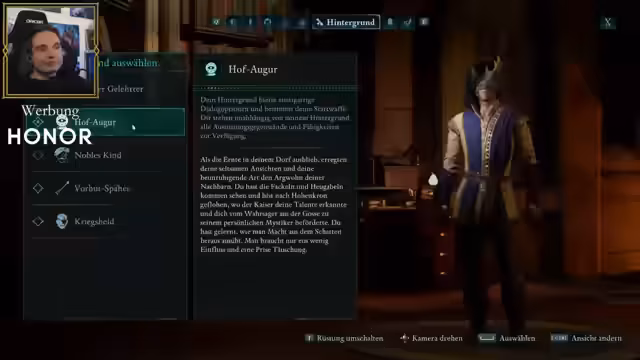 04:16:43Nach Abschluss des Character Editors präsentiert das Spiel verschiedene Hintergrundgeschichten für den Charakter, darunter Arcana Gelehrter, Hof Augur und nobles Kind. Jede Option bietet unterschiedliche Dialogoptionen und beeinflusst die Startwaffe des Charakters. Der Streamer initiiert eine Abstimmung unter den Zuschauern, welche Hintergrundgeschichte sie bevorzugen würden. Es wird ersichtlich, dass die gewählte Hintergrundgeschichte nicht nur die Einleitung des prägen wird, sondern auch nachhaltige Auswirkungen auf Dialoge und Spielablauf haben kann.