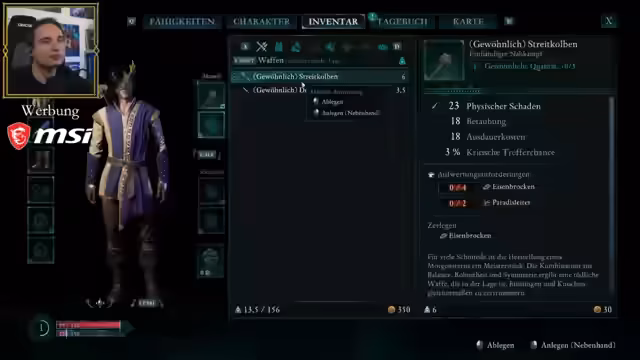 04:38:58Das Kampfsystem des Spiels erweist sich als eine Mischung aus Action und Mechanik. Der Streamer testet verschiedene Waffen wie Streitkolben und Dolche, wobei er feststellt, dass blocken viel Ausdauer kostet. Rüstung bietet zwar Schadensreduktion, reduziert aber auch Ausdauer. Interessant ist, dass die Waffenwechsel zwischen zwei Sätzen ermöglicht wird. Neben dem Kampf zeigt das Spiel auch ein Inventarsystem, das das Equipments von Waffen über Rüstung bis hin zu Consumables umfasst.