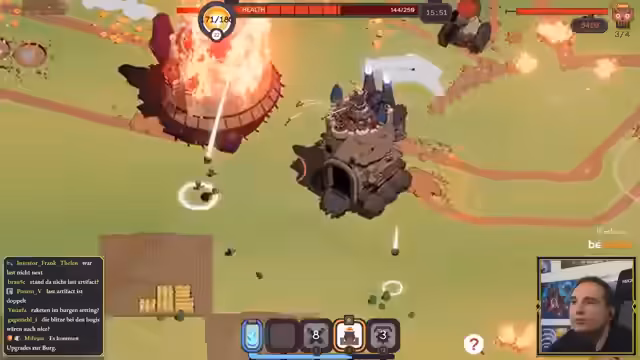 02:02:07Der Streamer entscheidet sich für den 'Mörser' und den 'Minenleger' als primäre Waffen. Er erklärt die Mechanik: Der Mörser schießt passiv auf Feinde in der Nähe und hat eine aktive Fähigkeit. Die Minen können hinter der Burg platziert werden, um Verfolger zu schädigen. Während des Spiels werden mehrere Upgrades gesammelt, die den Schaden und die Effektivität dieser Waffen erhöhen. Die Steuerung per Maus wird als angenehmer empfunden. Die Burg wird durch sammeln von Heilkisten repariert.
