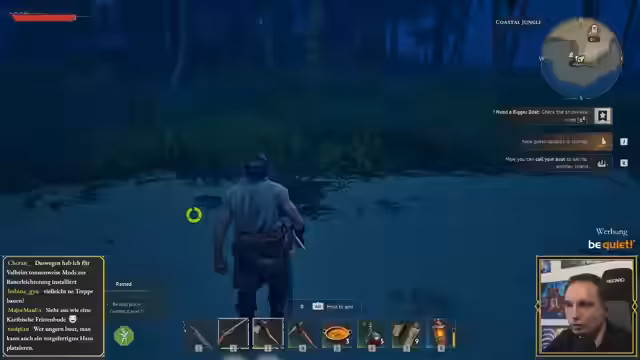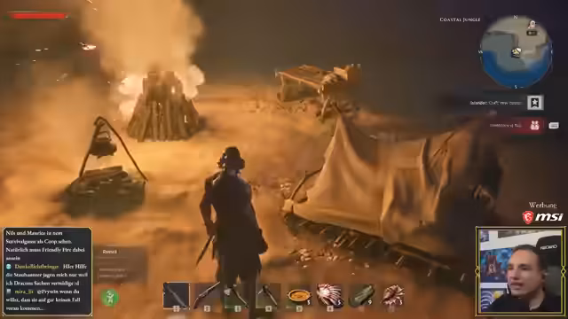 04:01:20Nach dem Entzünden des ersten Lagerfeuers beginnt der Streamer mit dem Sammeln von Ressourcen wie Holz und Stein, um erste Werkzeuge wie eine Axt und eine Hacke herzustellen. Er baut ein kleines Zelt als Wiederbelebungspunkt und erkundet die Umgebung, um Wildschweine zu jagen und Materialien für Rüstung zu sammeln. Das Bausystem wird als angenehm und der Fortschritt als motivierend empfunden.