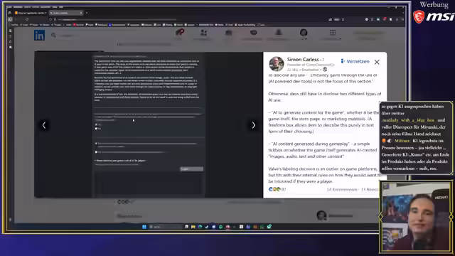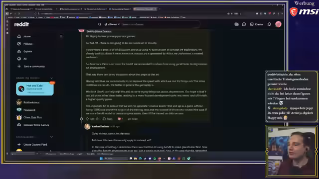 00:45:56Der Streamer erklärt, warum er aktuell keine zusätzlichen Spendenplattformen wie Ko-fi etablieren möchte. Er sieht es nicht als notwendig an, da er durch Sponsoren und Twitch-Abos finanziell gut dasteht und dies nicht als notwendig empfindet. Anschließend folgt eine intensive Diskussion über den Einsatz von KI in der Spieleentwicklung. Er spricht über die neuen Steam-Transparenzregeln für KI-Nutzung und diskutiert die vorherrschende negative Meinung der Gamer gegenüber KI, wobei er differenziert, dass es von der Art des Einsatzes abhängt und nicht automatisch ein qualitativ minderwertiges Ergebnis bedeutet.