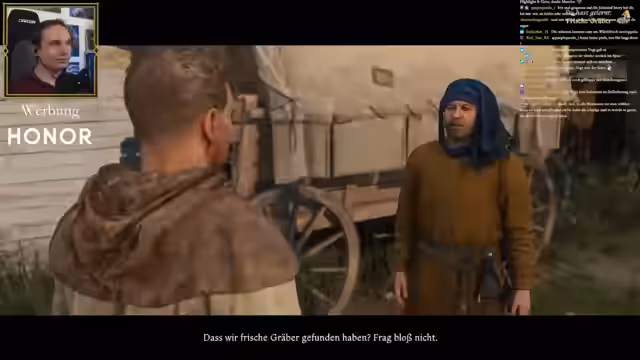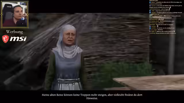 00:39:12Nachdem die Zuschauerabstimmung Kingdom Come 2 als nächstes Spiel ausgewählt haben, startet Maurice einen neuen Durchlauf. Der Titel des Streams wird entsprechend geändert, und Maurice beginnt mit dem Prolog. Die Story knüpft direkt an den ersten Teil an, wo Heinrich und Hans alles verloren haben und nun allein am Pranger stehen. Maurice erkundet die Umgebung, spricht mit NPCs und versucht, erste Quests zu starten, um Kleidung und Arbeit zu finden. Er bemerkt, dass das Spiel zwar atmosphärisch stark ist, aber die Dialogführung sometimes unnatürlich und zufällig wirkt.