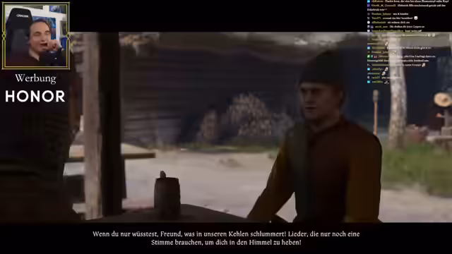 05:46:30Heinrich trifft die Kumanen außerhalb des Dorfes wieder, die ihm für seine Hilfe danken und ihn in ihr Lager einladen. Dort trinkt er mit ihnen, wobei er von Heiko Klinge, dem GameStar-Chefredakteur, dazu ermutigt wurde. Sie trinken Schnaps, der von Nomaden stammt und von dem angeblich schon Männer blind geworden sind. Heinrich unterhält sich mit einem der Kumanen über seine Herkunft und seine Erfahrungen im Krieg. Der Kumane erzählt von seiner Liebe zu einer Frau und seinem schwierigen Verhältnis zu den Nomaden. Schließlich wird Heinrich von dem Kumanen Jassak auf eine Schnapstour zu Holzfällern mitgenommen, obwohl er dies ablehnen möchte. Auf dem Weg dorthin begegnen sie einem sprechenden Hund.