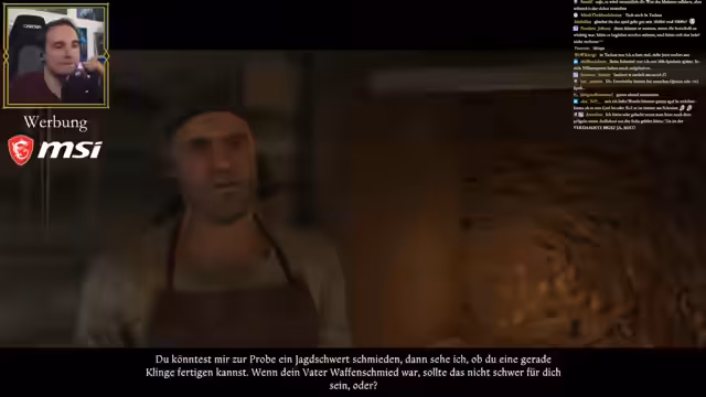01:39:35Der Streamer erkundet zunächst die Waren eines Händlers, der grundlegende Ausrüstung wie Essen, Retterschnaps und Waffen anbietet. Mangels genügend Groschen kann er jedoch nichts erwerben. Stattdessen konzentriert er sich darauf, als Schmiedegesell Arbeit zu finden, um in der Dorfschmiede Unterschlupf und Einkommensmöglichkeiten zu sichern. Diese Entscheidung begründet er damit, dass es ein ehrenvoller Beruf seines Vaters sei und praktische Vorteile für die aktuelle Situation bietet.