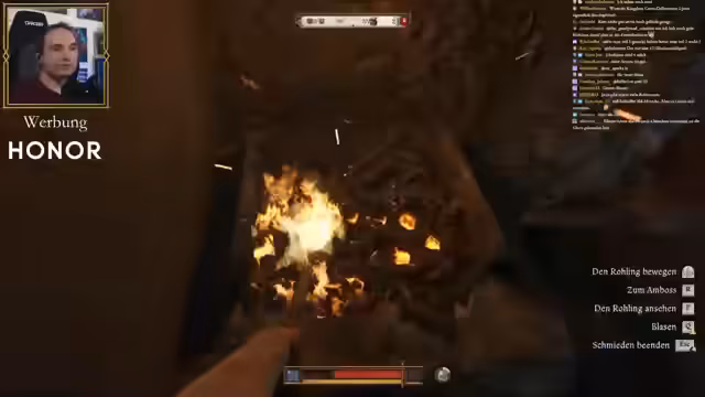 01:43:09Der Streamer beginnt mit dem Schmiede-Tutorial, indem er ein Jagdschwert herstellen muss. Der Prozess erfordert Präzision: Eisenrohling erhitzen, gleichmäßig bearbeiten und mit Hammer und Amboss formen. Nach mehreren Versuchen gelingt ihm ein Schwert der Qualität Stufe 3, besser als seine bisherige Ausrüstung. Dieser Erfolg gewährt ihm einen Handwerkspezialisierungspunkt und verschafft ihm sowohl im Spiel als auch bei Zuschaltern Anerkennung.